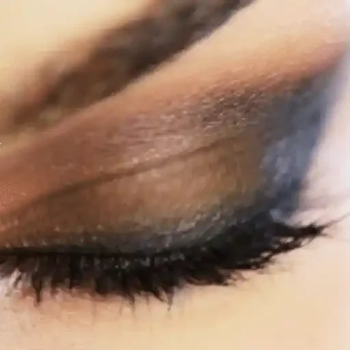 Ojo con párpado pesado y pestañas largas, expresión de cansancio o sueño.