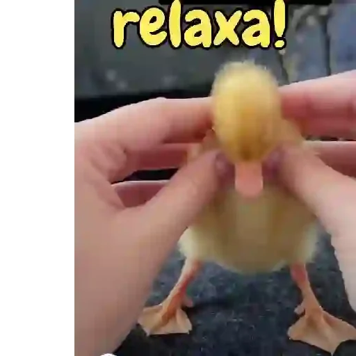 Un patito amarillo siendo sostenido por dos manos, con la palabra 'relaxa!' en amarillo arriba.