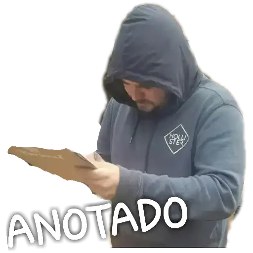Hombre con capucha leyendo un papel con el texto 'ANOTADO' en la parte inferior.