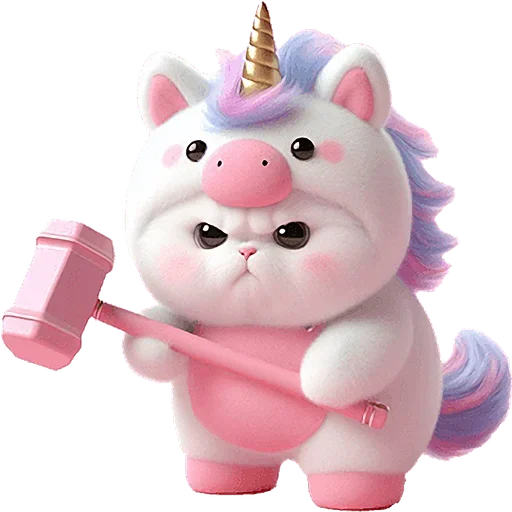 Un gato lindo con un cuerno de unicornio rosa y azul, sosteniendo un martillo rosa, con una expresión facial seria.