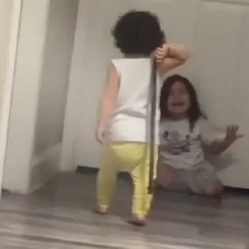 Un niño con una cinta o cuerda en la mano derecha y una niña sentada en el suelo al fondo, con las manos levantadas y expresión sorprendida.