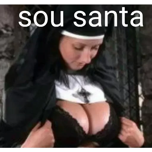 Una monja sexy con el texto 'sou santa' encima. Ella está usando un hábito de monja, pero con lencería sexy debajo.