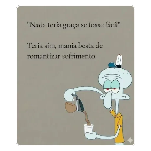 Un personaje de dibujo animado con una expresión triste y un objeto en la mano. Las frases "Nada teria graça se fosse fácil" y "Teria sim, mania besta de romantizar sofrimento" aparecen arriba y abajo de él.
