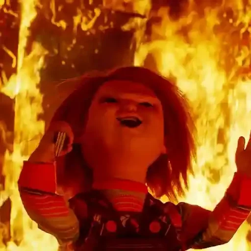 Chucky, la muñeca asesina, con una sonrisa siniestra delante de un fondo en llamas.