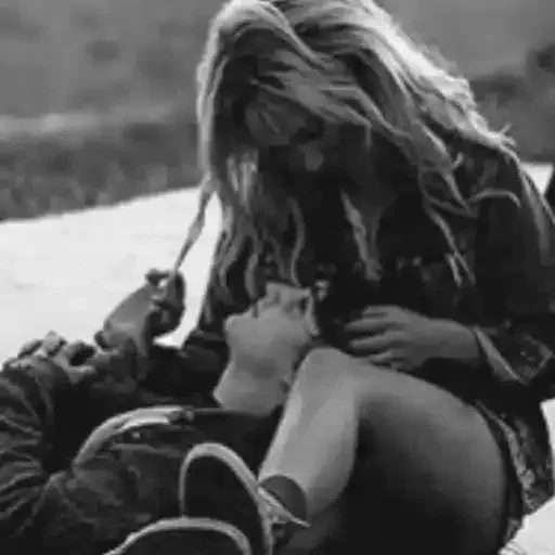 Pareja sentada al aire libre, mujer acariciando la rodilla del hombre, ambos parecen relajados y felices.