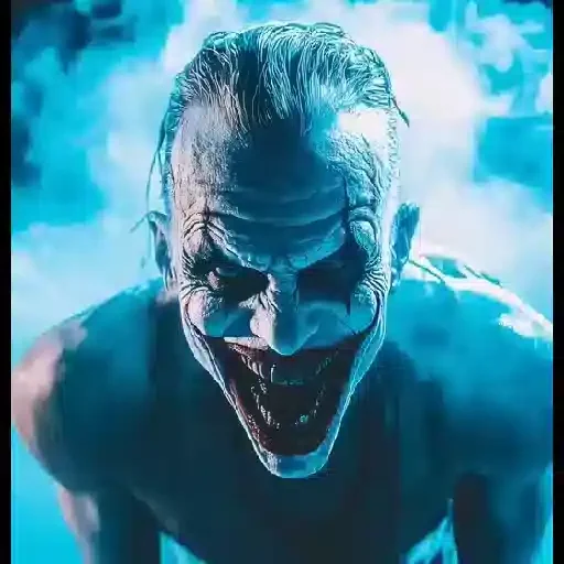 El Joker con expresión agresiva y sonrisa abierta, ojos abultados y cejas fruncidas, en un fondo azul turquesa con efecto de humo.