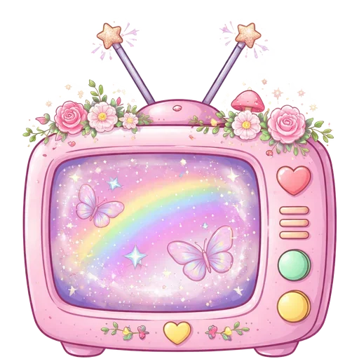 Un televisor rosa decorado con flores, estrellas y un arcoíris en la pantalla, con una mariposa rosa en el centro.