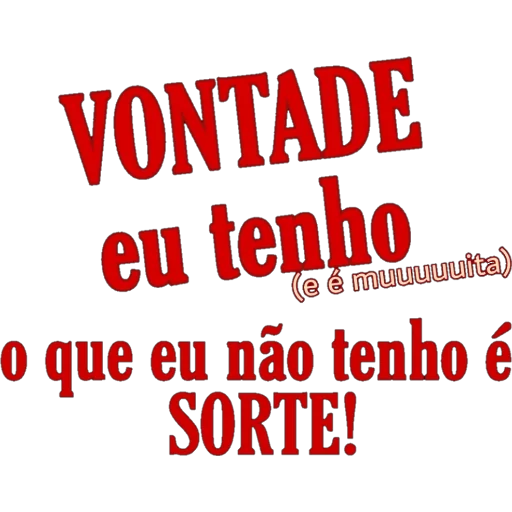 Una figurita con texto rojo sobre fondo blanco. El texto en letras mayúsculas grandes dice 'VONTADE eu tenho (a de morrer) o que eu não tenho é SORTE!'