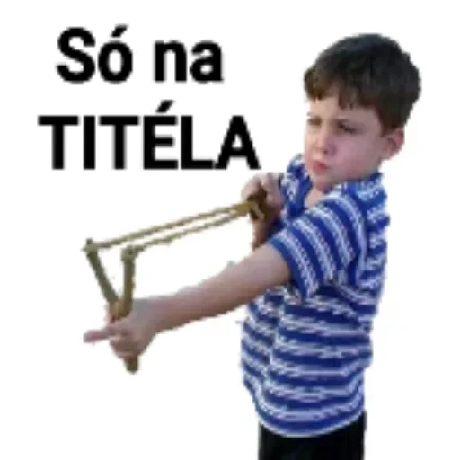 Menino de camisa listrada azul e branca apontando uma catapulta com as mãos, com o texto 'Lavai Pedra' embaixo.