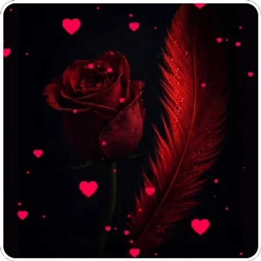 Una rosa roja con una pluma roja al lado, rodeada de corazones rojos pequeños en un fondo negro.