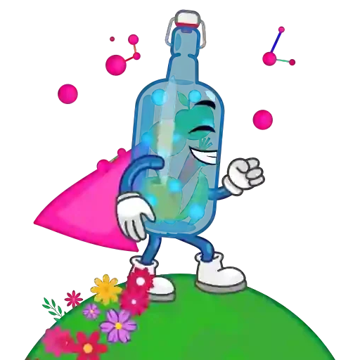 Um desenho de uma garrafa de água com expressão de dor de estômago, usando uma capa rosa e com moléculas ao redor.