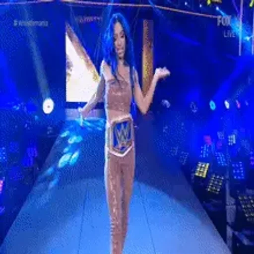 Una mujer con cabello azul y un bikini dorado está en una pasarela con luces azules y una audiencia al fondo.