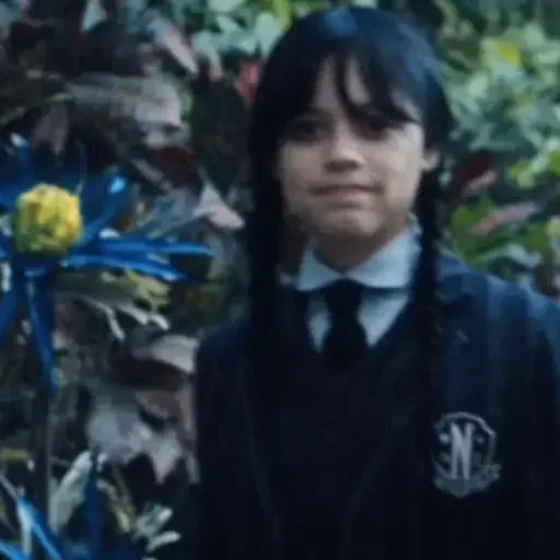 Una niña con trenzas negras y un uniforme escolar mira hacia adelante con una expresión seria, junto a una planta con flores azules y amarillas.