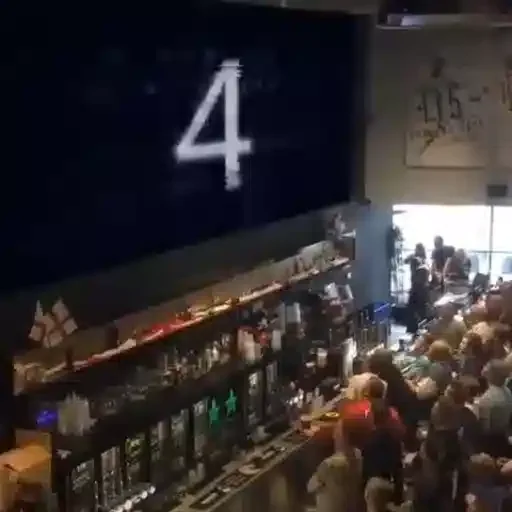 Imagen borrosa de una multitud en un bar o restaurante con un número 4 grande en una pantalla.