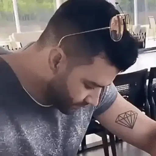 Hombre con corte de pelo corto y gafas de sol sobre la cabeza, mostrando un tatuaje de diamante en el brazo.