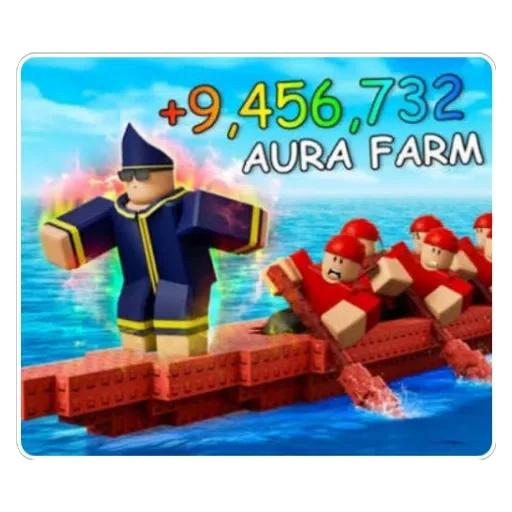 Un personaje de anime con un sombrero y ropa azul está de pie en un barco de madera, con otros personajes remando en el fondo. El texto '+9,456,732 AURA FARM' aparece arriba.