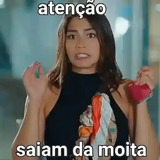 Una mujer con cabello castaño y un vestido negro, haciendo un gesto con las manos y sosteniendo un objeto rojo, con el texto 'atenção saiam da moita' superpuesto.