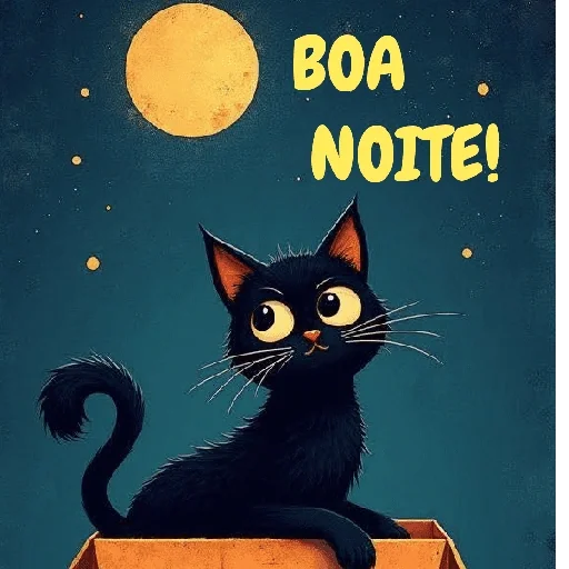 Un gato negro con ojos amarillos se sienta en una caja bajo la luz de la luna, con 'BOA NOITE!' escrito en amarillo.