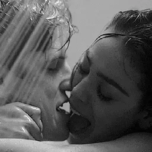 Pareja besándose bajo la lluvia, con los ojos cerrados y expresiones íntimas.
