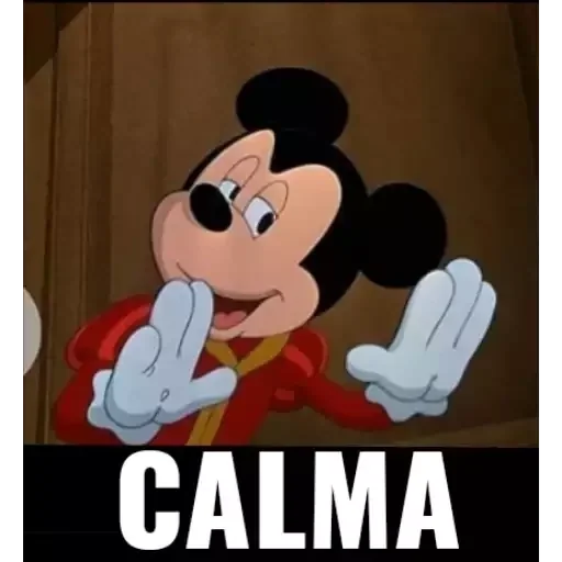 Mickey Mouse con expresión de sorpresa y manos levantadas, usando un abrigo rojo con cuello amarillo, contra un fondo marrón. La palabra 'CALMA' está escrita en blanco en la parte inferior.