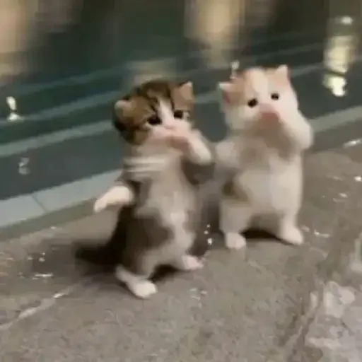 Dois gatinhos brancos em uma disputa fofa, um em pé e o outro deitado, ambos com expressões engraçadas.