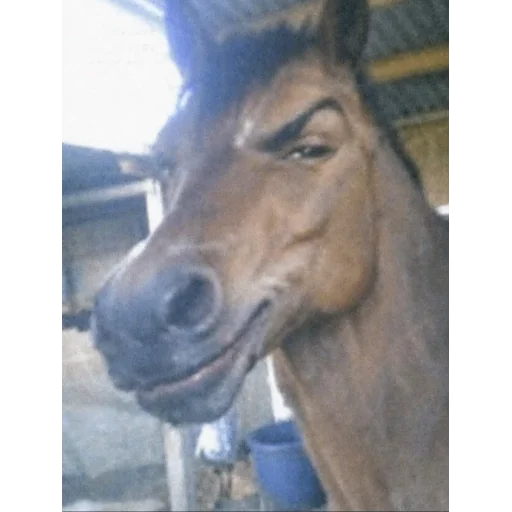 Cabeza de un caballo marrón con expresión facial relajada, hocico negro y crines negras, en un entorno con luz natural.
