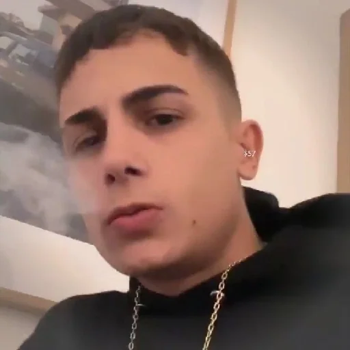 Rostro de un hombre joven con expresión seria, usando una sudadera negra y una cadena de oro, con un cuadro al fondo.