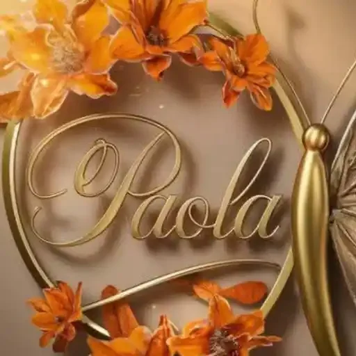 El nombre 'Paola' en letras doradas cursivas, decorado con flores naranjas y un insecto dorado.