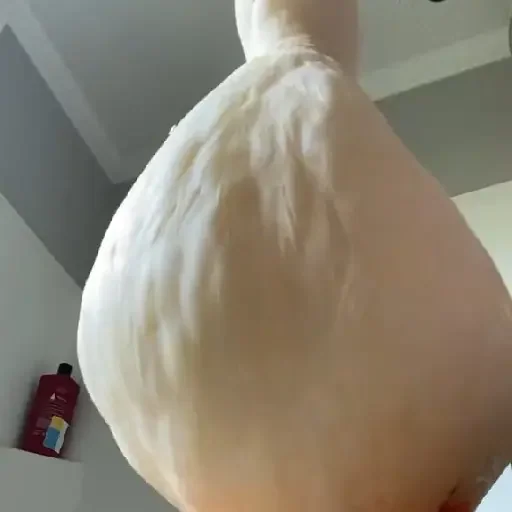 Un primer plano de un pollo blanco con plumas esponjosas, visto de cerca, en un entorno con paredes claras y un objeto rojo en el fondo.