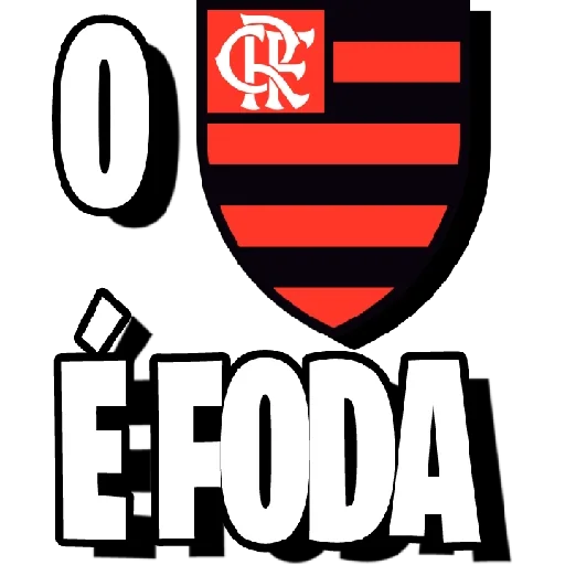 Escudo con franjas rojas y negras, texto 'É FODA' y número 0, con logotipo CR en la esquina superior.