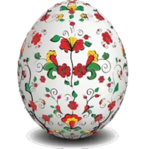 Un huevo blanco decorado con flores coloridas, mariposas y hojas en un patrón floral. Las flores son rojas, amarillas y verdes.