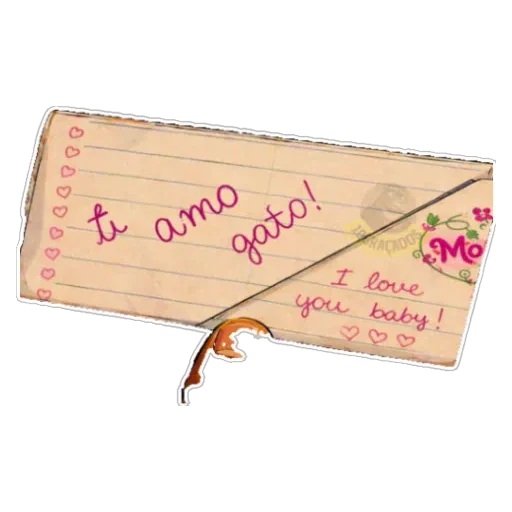 Un sobre de carta con el mensaje 'te amo gato!' escrito en rosa. El sobre tiene un sello con una pequeña cola y un sello con corazones.