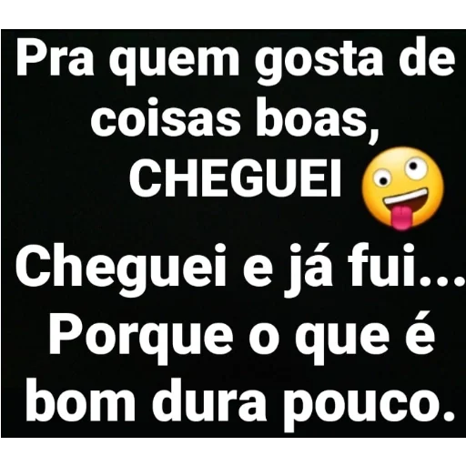 Un sticker con texto blanco sobre fondo negro. El texto dice: 'Pra quem gosta de coisas boas, CHEGUEI! Cheguei e já fui... Porque o que é bom dura pouco.' y tiene un emoji de cara sonriente con la lengua fuera.