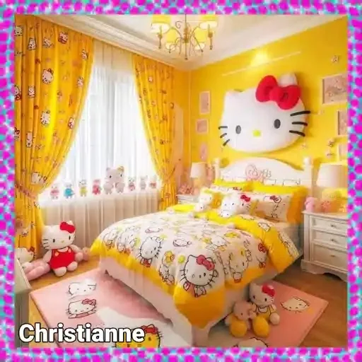 Habitación infantil decorada con el tema Hello Kitty, con paredes amarillas, cortinas y ropa de cama amarillas con flores, y varios objetos decorativos como un gran panel de Hello Kitty en la pared.