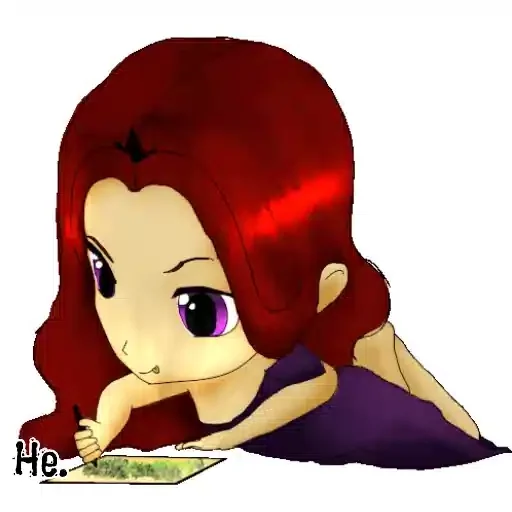 Una niña de pelo rojo escribe en un papel con una expresión pensativa, usando un vestido morado. Ella dice 'He.'