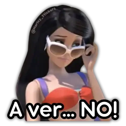 Una mujer de pelo negro con gafas blancas y un bikini naranja. Ella está tocando sus gafas y tiene una expresión pensativa. El texto 'A ver... NO!' está escrito debajo de ella.