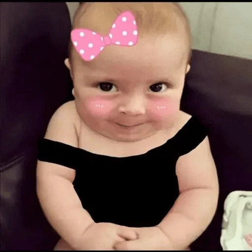 Bebé con un lazo rosa en la cabeza y rubor rosa en las mejillas, vestida con una blusa negra.