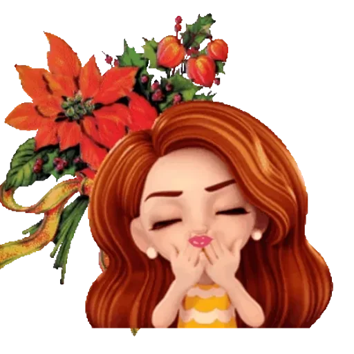 Una mujer pelirroja con las manos en el rostro y los ojos cerrados, con una flor de Navidad roja y hojas al lado.