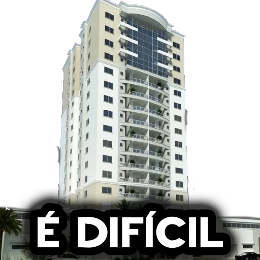 Un edificio alto y blanco con muchas ventanas y balcones, con el texto 'É DIFÍCIL' destacado en la parte inferior.