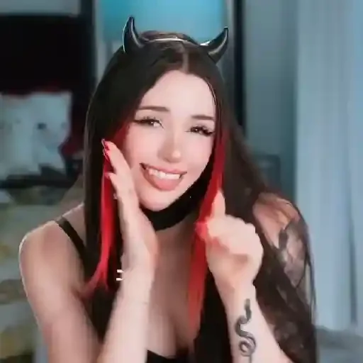 Una joven mujer con cabello negro y rojo, usando cuernos de diablo en la cabeza, haciendo un gesto con las manos y sonriendo.