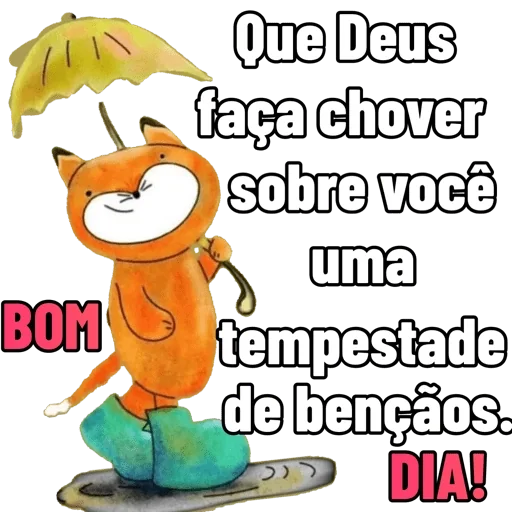 Un gato naranja con un paraguas amarillo y botas verdes, con la frase 'Que Deus faça chover sobre você uma tempestade de bençãos. BOM DIA!'