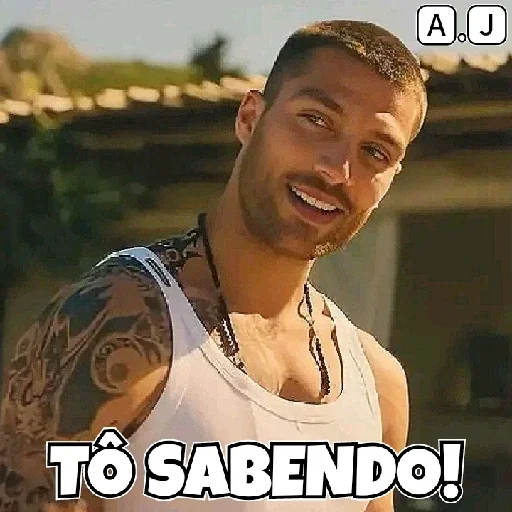 Hombre con short de gimnasio blanco y tatuajes, con expresión de sorpresa o curiosidad. Él dice 'Tô sabendo!'