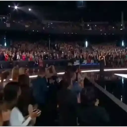 Multitud en un estadio de noche, con gente de pie y aplaudiendo, luces brillantes de fondo.
