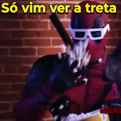 Deadpool con gafas blancas y un bastón, contra una pared de ladrillos, con la frase 'Só vim ver a treta'