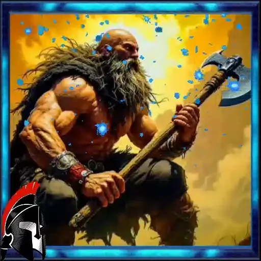 Un guerrero musculoso con barba larga y cabello despeinado, que viste una capa de piel, sostiene un hacha grande. Está sentado en una postura poderosa contra un fondo naranja con nubes y efectos de luz.