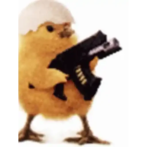 Un pollito amarillo con un casco blanco sostiene una gran arma negra.