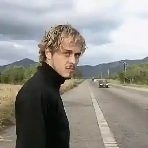 Hombre rubio con expresión seria en una carretera con montañas al fondo.