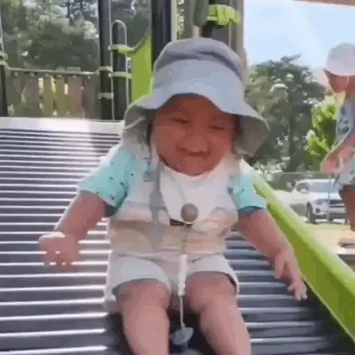 Un bebé sonriendo mientras baja por un tobogán, con un sombrero de sol y un mono beige con mangas cortas azules.