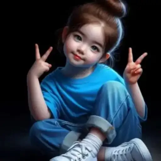 Niña con cabello castaño en un moño, usando una camiseta azul, haciendo un gesto de 'paz' con las manos.