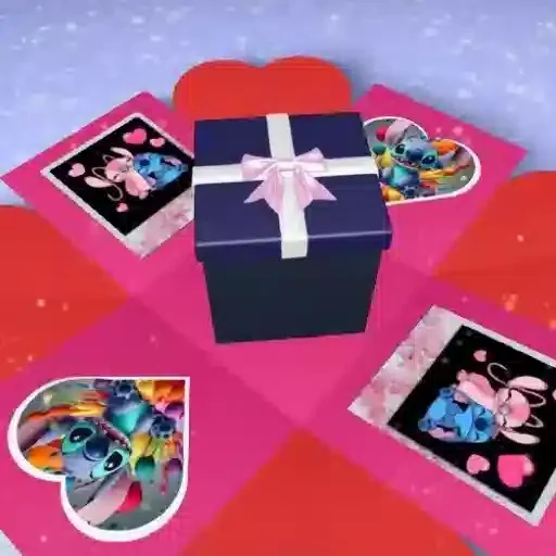 Caja de regalo azul con cinta blanca y lazo rosa, rodeada de tarjetas coloridas con imágenes de parejas abrazándose, en un fondo rosa.
